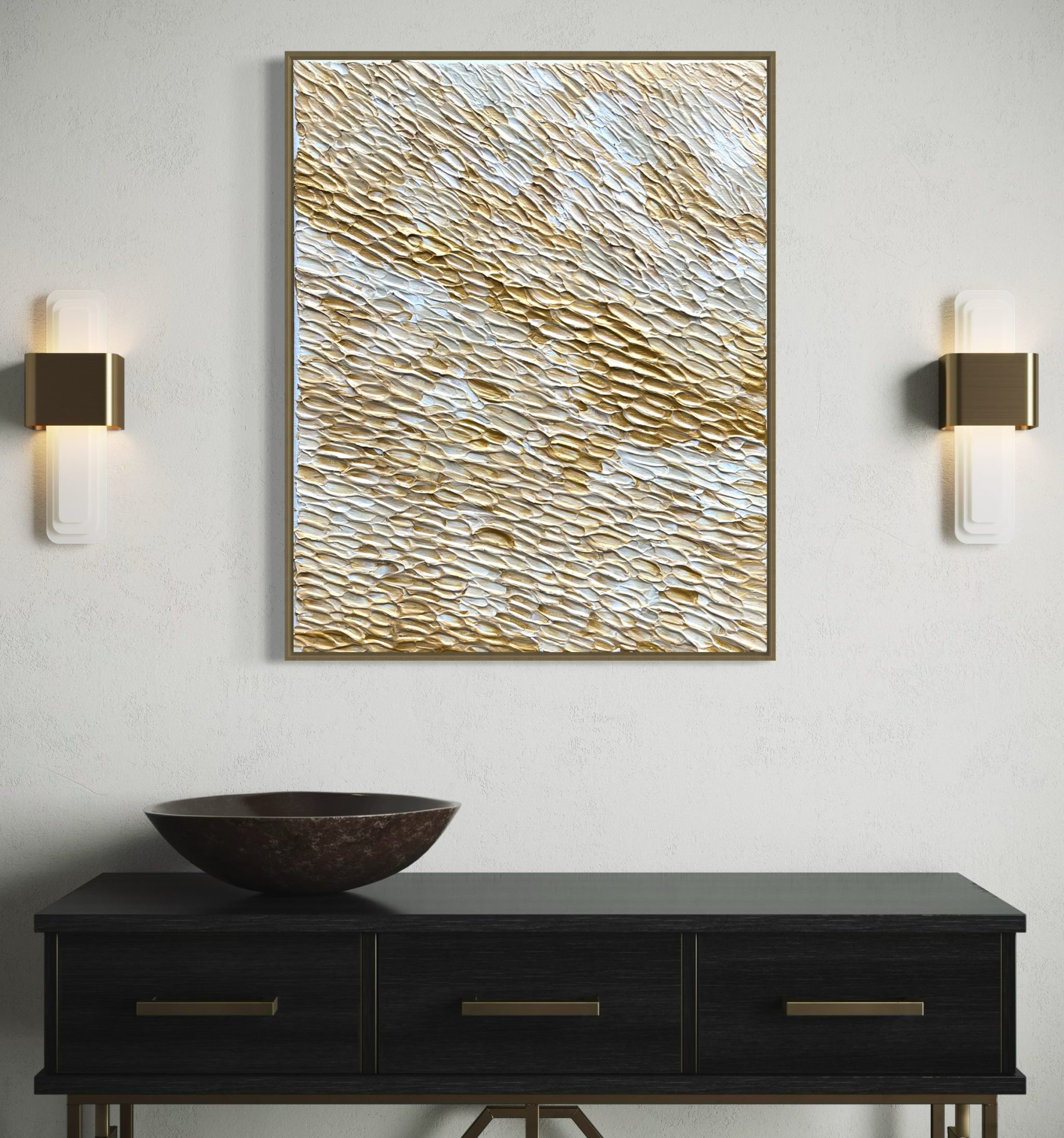 DESCRIPTION: Glimmers of gold is a painting that celebrates the moments that make life special. Set against a majority of cream and beige tones, vibrant glimmers of gold weave through the painting, catching light from the surroundings. If every stroke were gold, the impact would be lost in a sea of sameness. It is the contrast and the rarity of the golden accents that make them so meaningful, reminding us that it is the unexpected joys that bring life to our everyday existence.