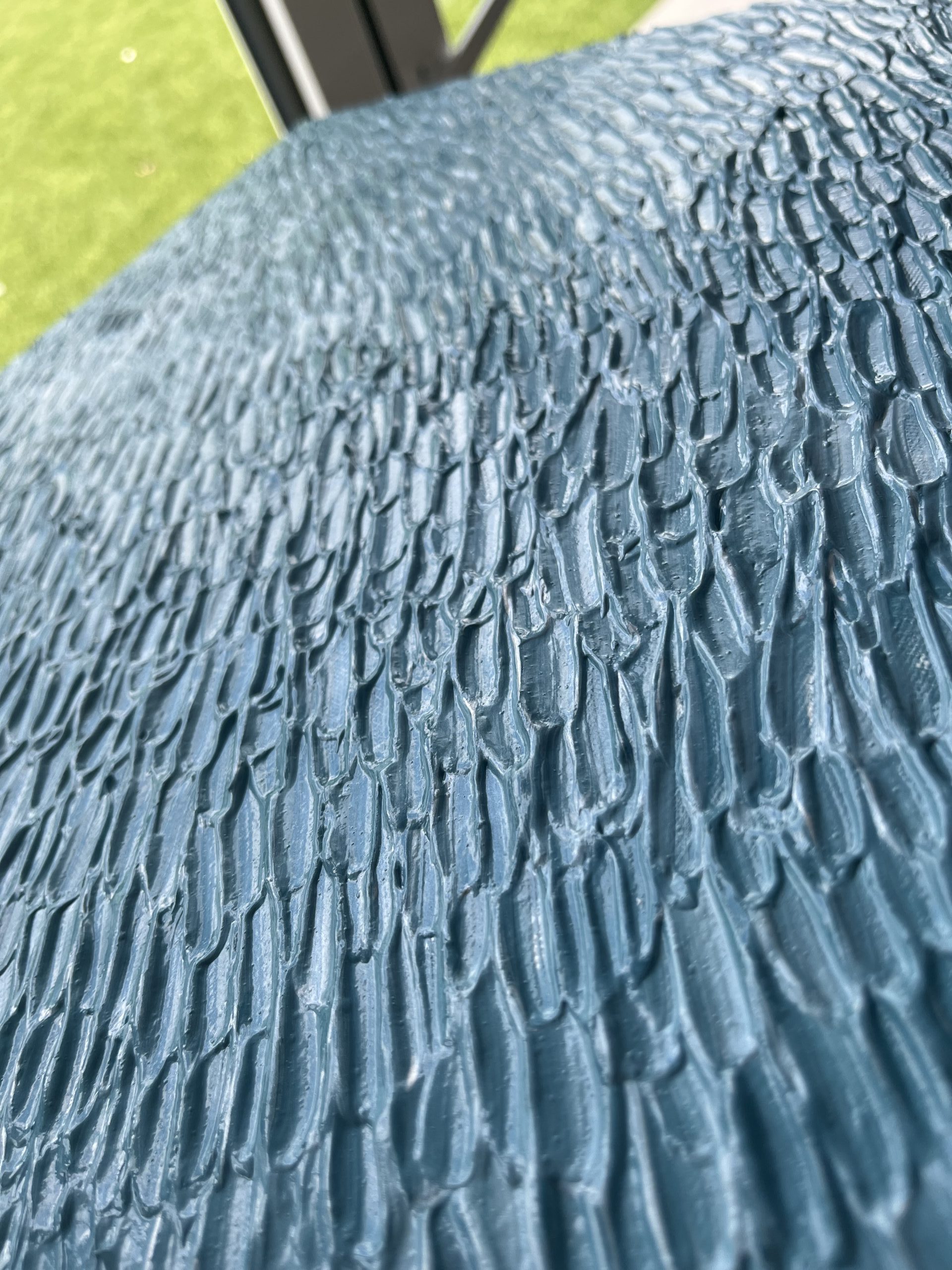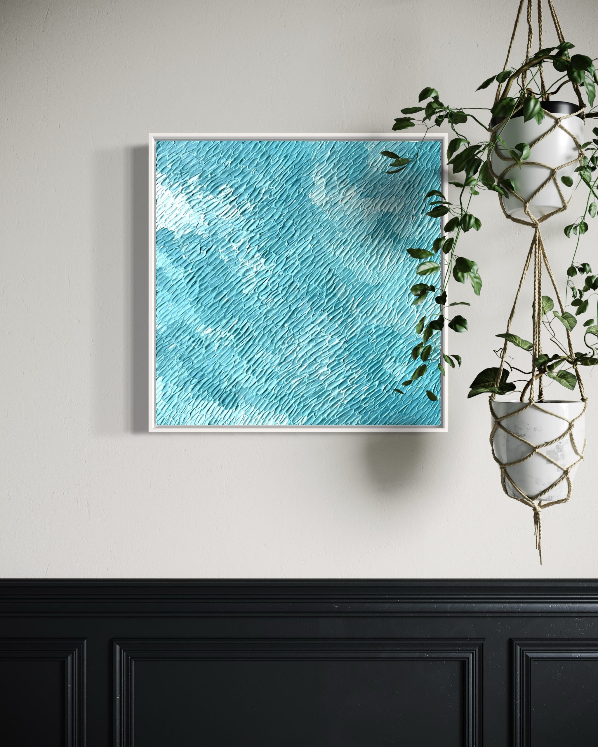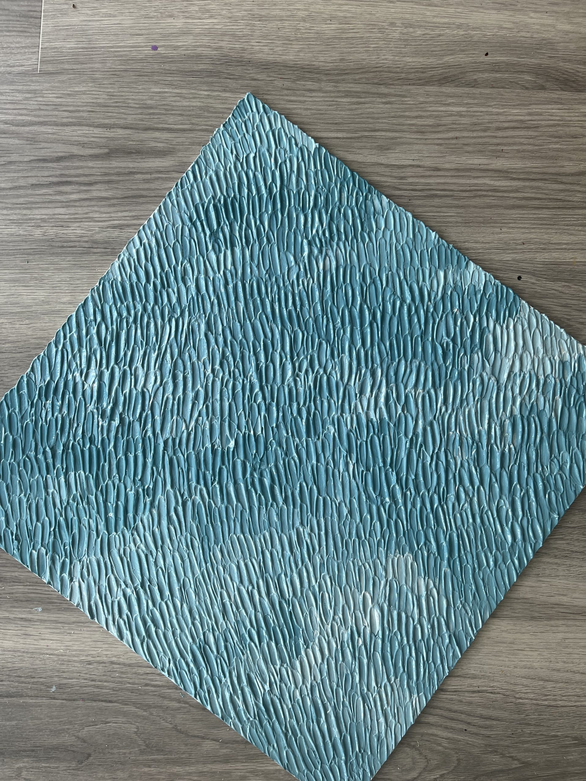 This painting captures the beauty of the ocean as seen from a plane or helicopter's vantage point. The texture from afar blends seamlessly, to create an appearance of waves from high above the oceans surface. The interplay of light and shadow from this far away gives rise to a feeling of soaring over the endless expanse of water, with the ocean seemingly having no end. Yet, when the painting is viewed up close, each individual stroke of paint becomes visible, making the expanse of the sea appear more finite.