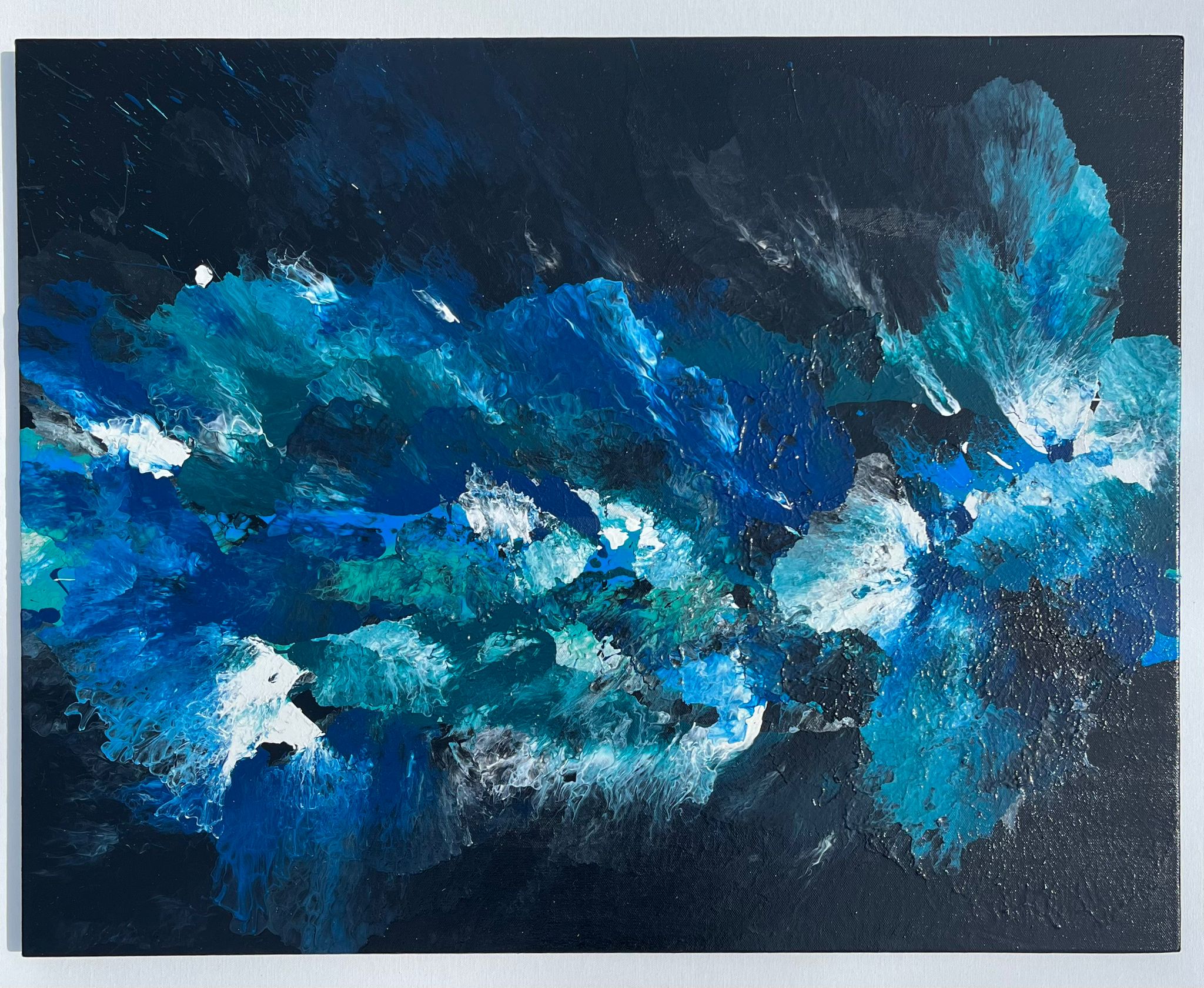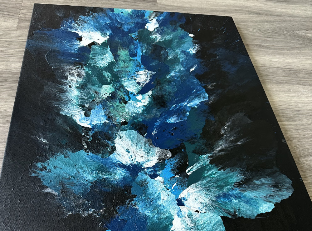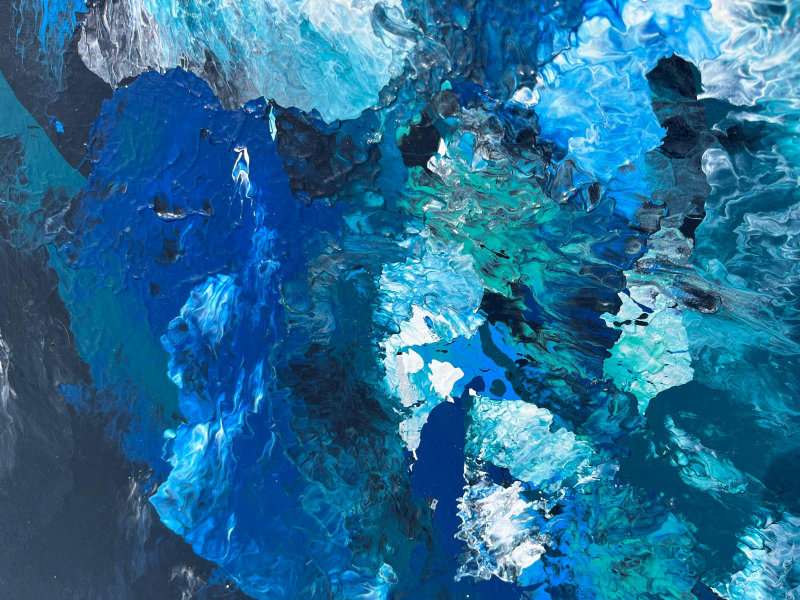 DESCRIPTION: 'Turmoil of the Tides', a painting that encapsulates the sheer unpredictability within the oceans movements. The various colours within this painting consume every inch of space, reflecting the dynamic nature of the tides and the powerful forces at play within the sea. Not one colour spreads to look the same as another, in the same way the waves of the sea crash and cascade into currents of confusion.